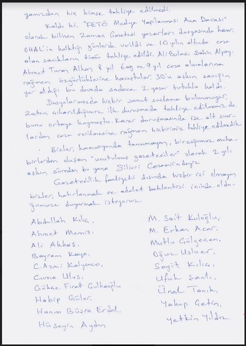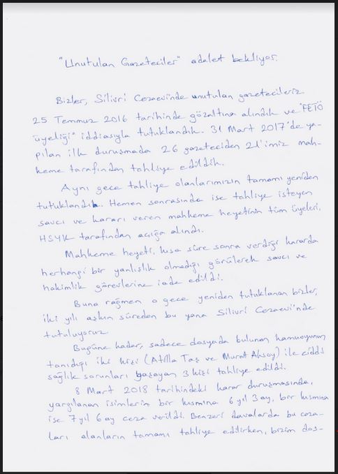 İstanbul Silivri Cezaevi’nde 2 yılı aşkındır haksız şekilde hapis yatan tutuklu gazeteciler bir mektup yazarak adalet talebinde bulundu. Halen cezaevinde yatan Abdullah Kılıç, Ahmet Memiş, Ali Akkuş, Bayram Kaya, Cemal Kalyoncu, Cuma Ulus, Gökçe Fırat Çulhaoğlu, Habip Güler, Hanım Büşra Erdal, Hüseyin Aydın, M. Sait Kuloğlu, M.Erkan Acar, Mutlu Çölgeçen, Oğuz Usluer, Seyit Kılıç, Ufuk Şanlı, Ünal Tanık, Yakup Çetin, Yetkin Yıldız ‘Unutulan Gazeteciler Adalet Bekliyor’ başlığıyla sosyal medya aracılığıyla bir mektup ve çağrı yayınladı.