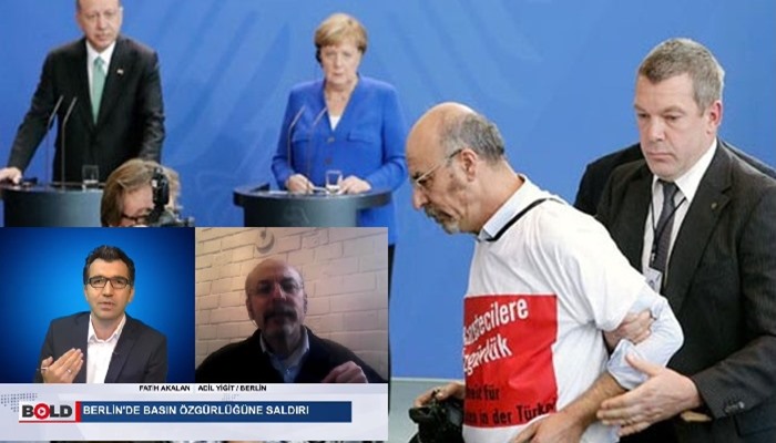 Bold Medya’da Fatih Akalan’ın sunduğu programda AKP’li Cumhurbaşkanı Tayyip Erdoğan’ın son Almanya ziyaretinde Başbakan Merkel ile yaptığı basın toplantısı konuşuldu. Ortak basın toplantısında bir gazeteci korumalar tarafından dışarı atıldı. Erdoğan yaşananları gülümseyerek izlerken Merkel ise şaşkındı. Basın özgürlüğüne yönelik bu uygulamanın mağduru gazeteci Adil Yiğit, Bold Medya’nın konuğu oldu.